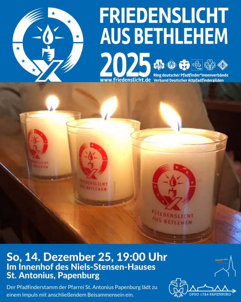 Auch in diesem Jahr verteilen die Pfadfinder aus St. Antonius wieder das Friedenslicht. Am Sonntag, 14.12., um 18 Uhr, laden sie zu einer kleinen Andacht und Verteilung des Friedenslichtes im Innenhof des Niels-Stensen-Hauses ein.