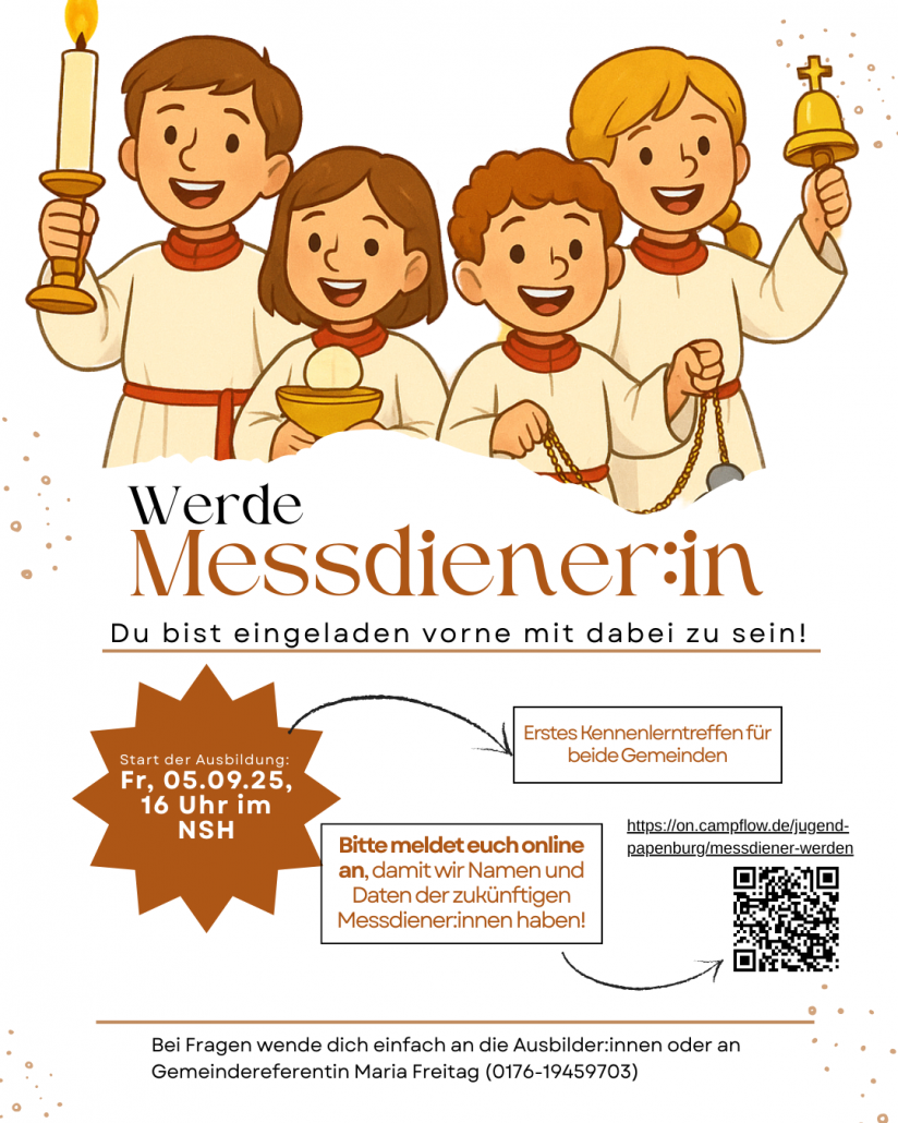 Der Start der Ausbildung findet am Freitag, den 05. September 2025, um 16.00 Uhr im NSH statt. Bei diesem ersten Treffen werden sich die zukünftigen Messdiener:innen sowie die Ausbilder:innen kennenlernen.