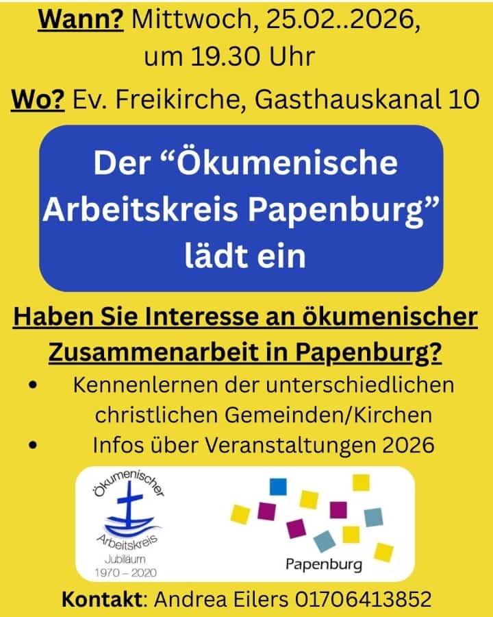 Am Mittwoch, 25.2., findet die nächste Sitzung des Ökumenischen Arbeitskreises statt. Dazu sind alle Interessierten, die sich gern über die ökumenische Arbeit in Papenburg informieren möchten, herzlich eingeladen: