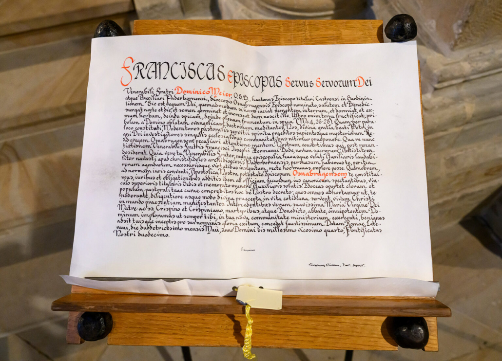 Nachdem der Apostolische Nuntius Erzbischof Nikola Eterovic die päpstliche Ernennungsurkunde im feierlichen Einführungsgottesdienst von Bischof Dominicus überreicht hatte, zeigte Weihbischof Johannes Wübbe sie allen Anwesenden und verlas die Übersetzung:
