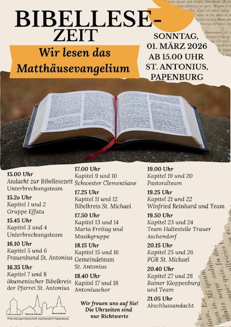 Wir starten um 15.00 Uhr. Gegen 21.30 Uhr werden wir dann das letzte Kapitel lesen und damit unsere 1. Bibellesezeit in der Pfarreiengemeinschaft beenden.