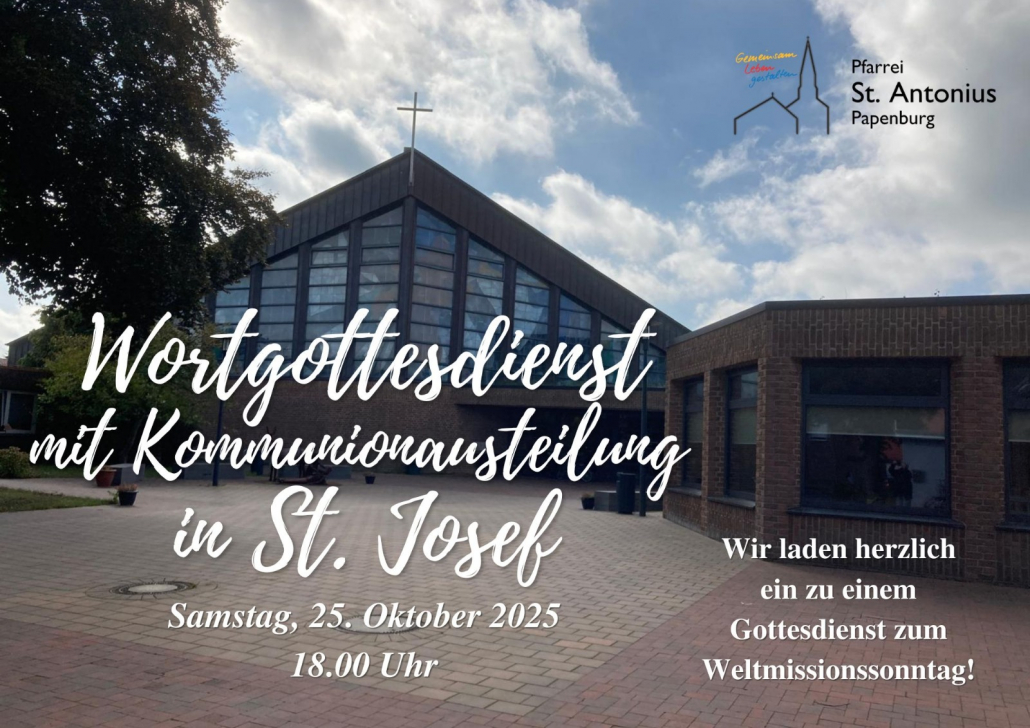 /in AktuellDer Wortgottesdienst in St. Josef am Samstag, 25.10.2025, um 18 Uhr hat das Thema „Hoffnung lässt nicht zugrunde gehen“ (Röm 5,5), das Motto des diesjährigen Weltmissionssonntages.