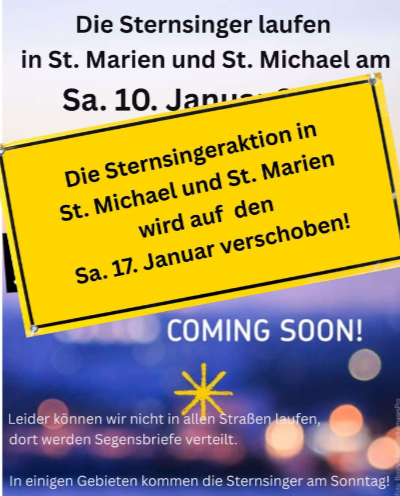 /in AktuellDas für den 10.1. vorgesehene Sternsingen im Bereich von St. Michael und St. Marien wird witterungsbedingt auf den 17. Januar verschoben.