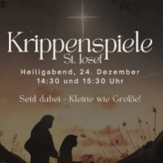 Um 14:30 Uhr und 15:30 Uhr werden die Krippenspiele aufgeführt. Ein Einsingen findet vorher statt. Herzliche Einladung zum Mitsingen!