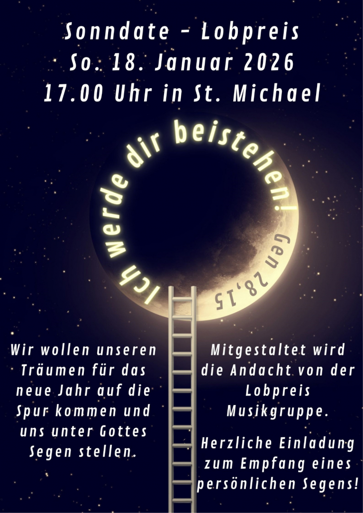 Wir wollen unseren Träumen für das neue Jahr auf die Spur kommen und uns unter Gottes Segen stellen. Zu dieser Andacht am 18.1. um 17.00 Uhr in St. Michael laden wir Sie herzlich ein.